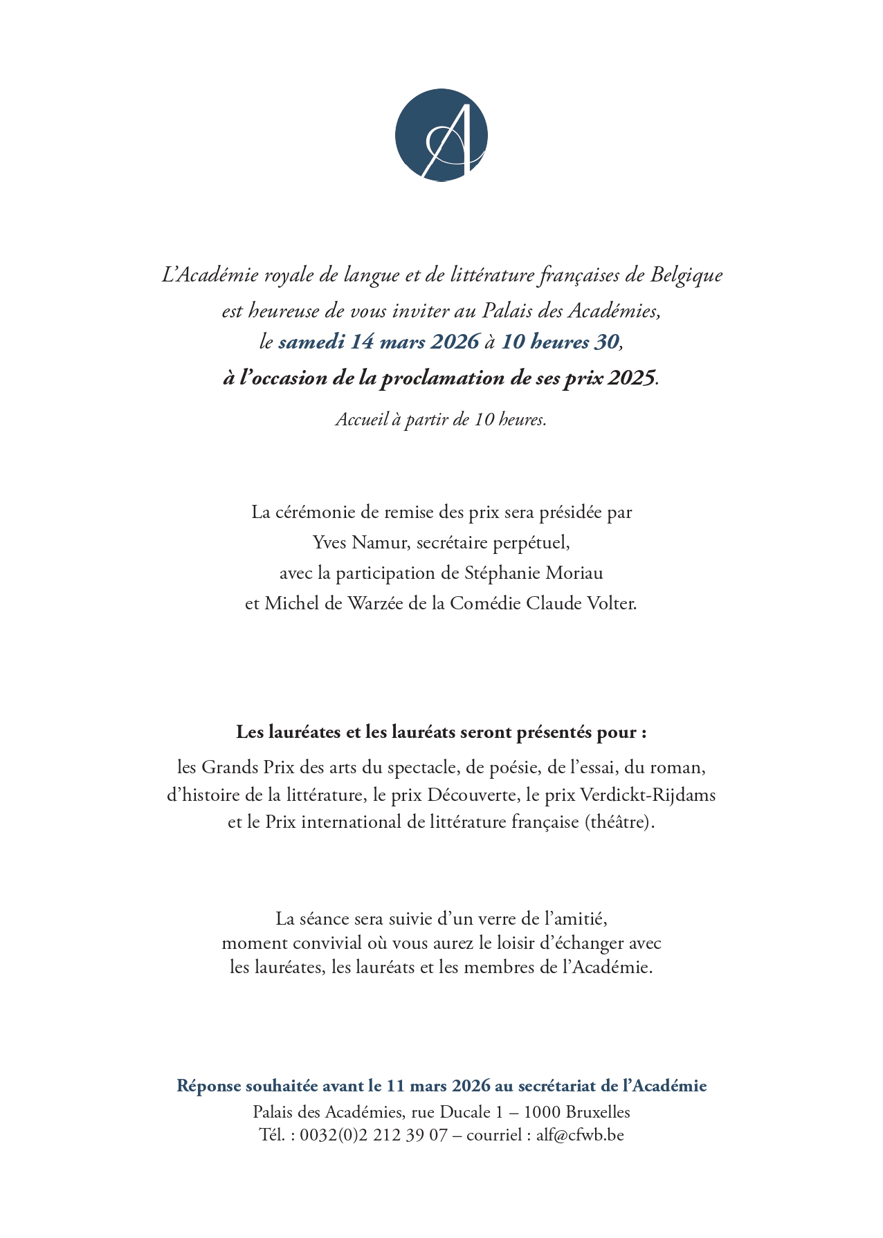 Remise des Prix 2025 de l'Académie royale de Langue et Littérature françaises - Samedi 14 mars 2026.